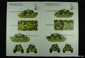 Included are fairly easy to follow instructions. That being said they do assume a certain amount of familiarity working with model kits. For example modellers are expected to know about undergates and how to remove them accordingly from certain parts. If you are a beginner you won't instinctively know when and where you'll need to do this. And when I first started out I didn't. Luckily my experience with Bandai's 'noob-proof' instructions early on stood me in good stead when dealing with MENG's vaguer guide. Meanwhile also included are four different color schemes for the Königstiger.