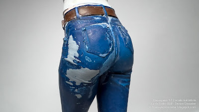 Ever had that nanosecond of wool-gathering while you were in the midst of a painting session that just absolutely ruins days of meticulous work. Well I have, almost too many times. And this particular fubar was an absolute horror show! So what happened was during the application of a water-based matt coating agent i.e. the Mr.Hobby Mr.Premium Top Coat Flat on the Girl's Rider figurine's denim jeans, I mentally switched off and kept my finger depressed too long on the spray trigger. Even after I noticing my mistake it still took me a further second or so to react. By then the jeans was covered in too much coating agent and showing the dreaded whitening effect. But it gets worse ...